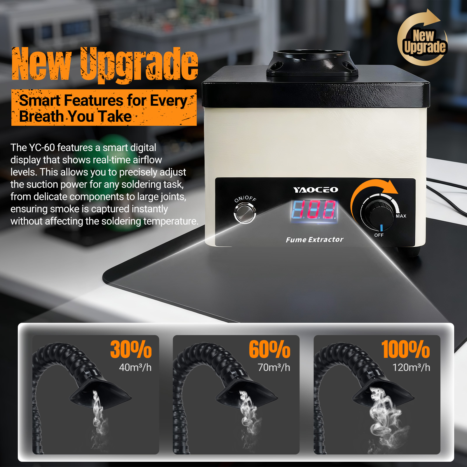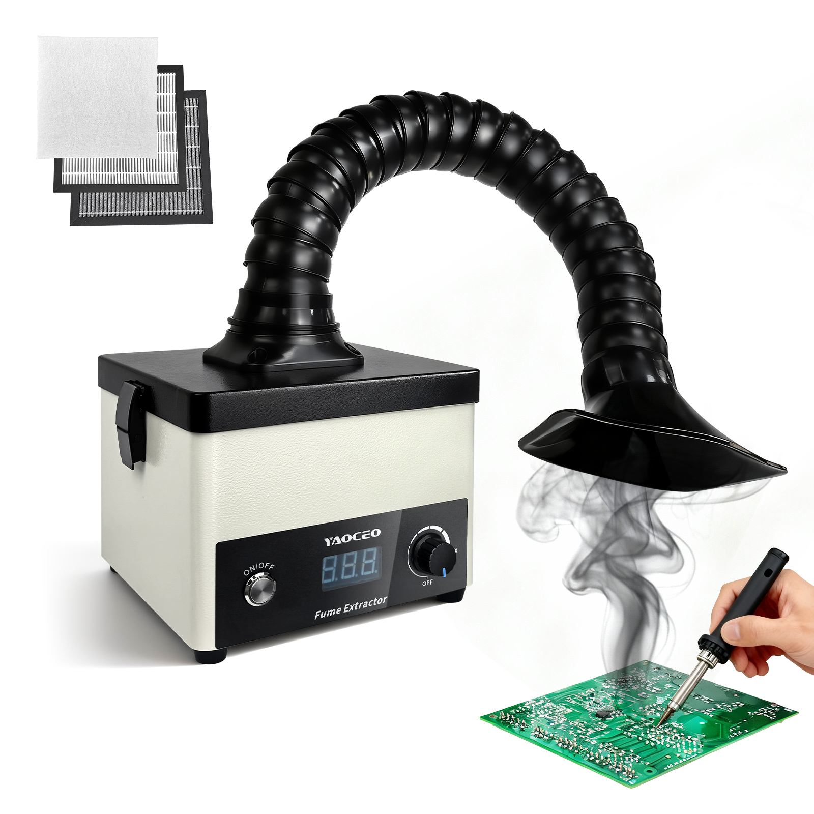 YC60 Solder Fume Extractor, High Power Solder Smoke Absorber with Digital Display & Speed Control, 3-Stage Filtration (HEPA+Carbon), Fume Extractor for Desktop Soldering,Welding-Includes 5 Pre-Filters